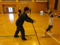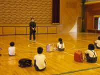 「学校に不審な人が尋ねてきた」との想定で避難訓練を行いました。前半は、職員の不審者対応訓練を行いました。後半は、輪島警察署の方のお話を聞き、その後、大声を出して逃げることや、ランドセルをつかまれた時や腕をつかまれた時の対処法について、実際に体験してみました。