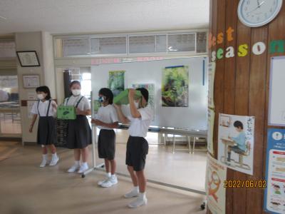 全校集会がありました。給食・保健委員会の4人が、クイズ形式で、「体と健康について」発表してくれました。
