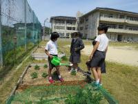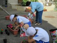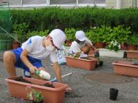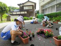 校舎周りに植えられた紫陽花の花が色づきはじめました。それに伴い、玄関前のプランターの花の植え替えを行いました。毎年、鵠巣公民館から苗や土の提供をしていただいています。今回は、5・6年生4名が慣れた手つきで作業を進めていました。