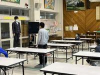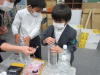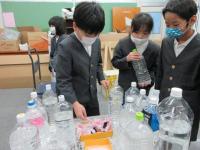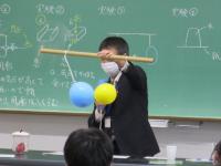 はじめに、理科室で「気圧」についての授業を受けました。実験結果を予想し、そのわけを考えるという内容でした。少し難しかったけれど、大きな教室でたくさんの仲間と学習する中学の雰囲気を味わうことができました。