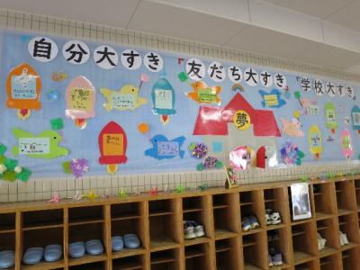 児童玄関に「将来の夢」を掲示して1年が経ちます。そこで、再度「あなたの夢は何ですか?」と尋ねてみました。1年前と変わらない子もいれば、1年前とは違った夢を思い描いている子もいました。今回は、「夢に向かって飛び立とう」との思いで、台紙を鳥とロケットにし、好きな方を選んでもらいました。校務士の山口さんが、周囲を素敵に飾って下さいました。