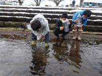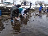 あれから約2ヶ月、いよいよヤマメの稚魚を川に放流することにしました。子どもたちはペットボトルのふたをあけ、やさしく傷つけないようにそっと川に放していました。元気いっぱい泳いでいくヤマメに、いったいどんな言葉かけをしたのか聞いてみたいですね。
