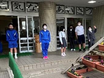 放送委員会の子どもたちが玄関前に立ち、元気に挨拶してくれました。