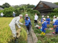 塚田の表さんに指導していただきました。機械での作業が多くなってきている中、手作業での稲刈りやはざかけは、児童にとって貴重な体験になりました。