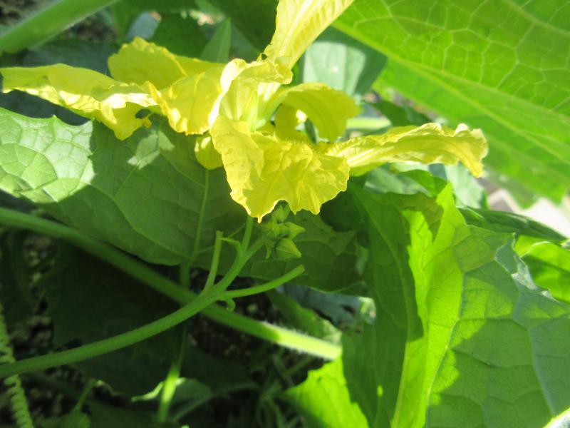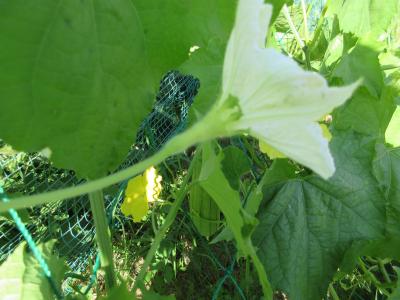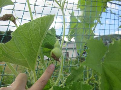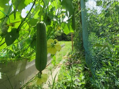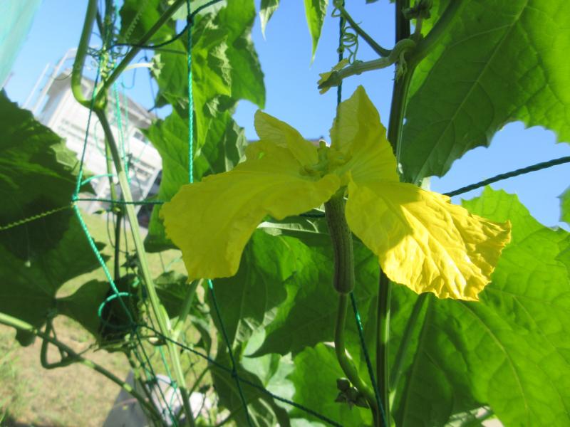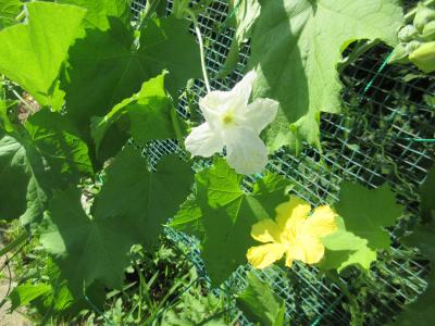 ヘチマが、ぐんぐん伸びています。そして、めばな3つ、おばな3つさきました。実がなるのが楽しみです。