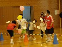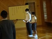 二つ目は、「不審者対応防犯訓練」です。体育館で不審者に遭遇した場合の危険回避の訓練を行いました。「自分の身を守る」ために、ランドセルを投げ、大きな声を出して逃げることを体験を通して学びました。