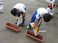 6時間目の時間に公民館長の北川さん、松岡さんに教えていただきながら5、6年生が校門前の花の植え替えをおこないました。