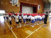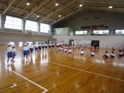 6校の児童が集まって初めての行事である運動会が明後日開かれるため、本日、体育館で予行が行われました。