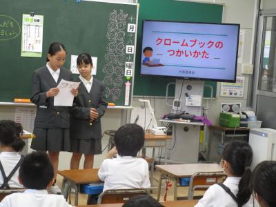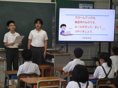 代表委員会の今月の全校目標は「クロームブックを正しく使おう」です。そこで、代表委員会では、各クラスに行って、クロームブックを使う上でのルールを説明してきました。輪島市が、みなさんの勉強のために貸してくれているクロームブックです。これからもルールを守り、感謝の気持ちをもって使っていきましょう。