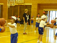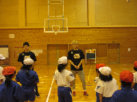 プロバスケットチーム金沢武士団(サムライズ)のバスケット教室がありました。中島卓也選手と加藤悠三選手がいろいろな練習法でバスケットボールの楽しさを教えてくれました。プロならではのパフォーマンスを間近で見た子どもたちはとても大喜びでした。最後には子どもたちと試合もしてくださり、大変盛り上がりました。武士団(サムライズ)の皆様どうもありがとうございました。