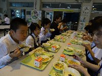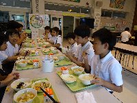 今日の給食は縦割り班で給食を食べる、なかよし給食でした。