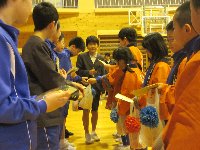 忍者学校で1・2年生が進級試験を合格するために、6年生にヒントをもらったり、6年生に松ぼっくりけん玉をしてもらったりしました。