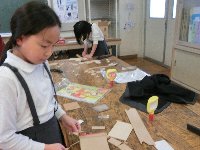 4年生はどんな形や色にしたら楽しい楽器になるかを考えながら、のこぎりで木を切ったり、釘を打ったりしていました。