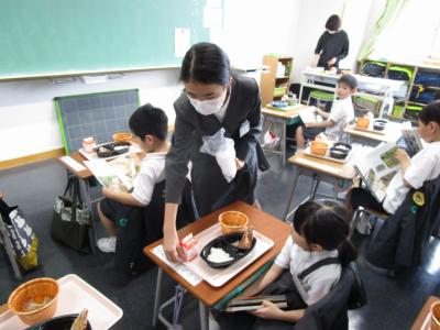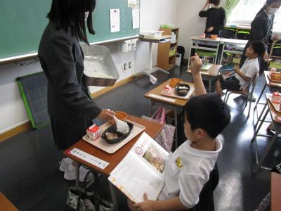 おいしそうな給食を手に取り、嬉しそうな笑顔を見せたり、6年生は1年生の給食の配膳をしていました。