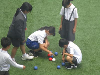 5年生が男女混合チームで仲良くボッチャに取り組んでいました。白いジャックボールに狙いを定めて青や赤の球を投げるのですが、それがなかなか難しいのです・・・。初夏の日差しが降り注ぐ中庭に、楽しそうな歓声が響いていました。