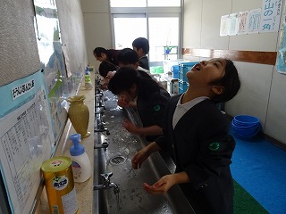 長休みに児童放送委員会の放送を合図に、手洗いうがいをしています。