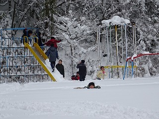 放課後、児童は積もった雪で遊びながら帰りました。