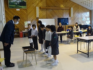 鵠巣地区社会福祉協議会・民生委員会の方々から児童におもちのプレゼントがありました。
