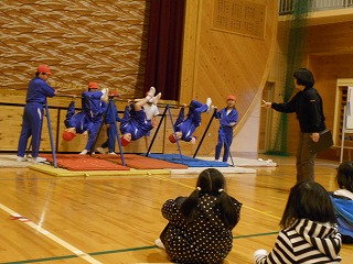 3・4年生の学年発表では、鉄棒・マット・とび箱の技の披露や上手になるための練習の紹介がありました。すご技の時は「おおお!すごい!」と歓声が上がりました。