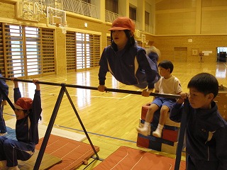 3・4年生の全校集会での発表を見て、1・2年生も体育で鉄棒をやってみました。