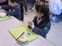 今日の給食は、新米でおにぎりを作って味わいました。炊きたてご飯のいい香りをかぎながら、自分の好きな具を入れて握ったおにぎりは、最高に美味しかったです。