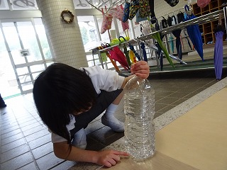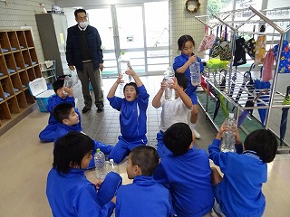 自分のペットボトルに入った卵を見て、「目がある」「いつうまれるのかな」と興味津々でした。しばらく、あまり光のあたらないところでたまごがふ化するのを待ちます。