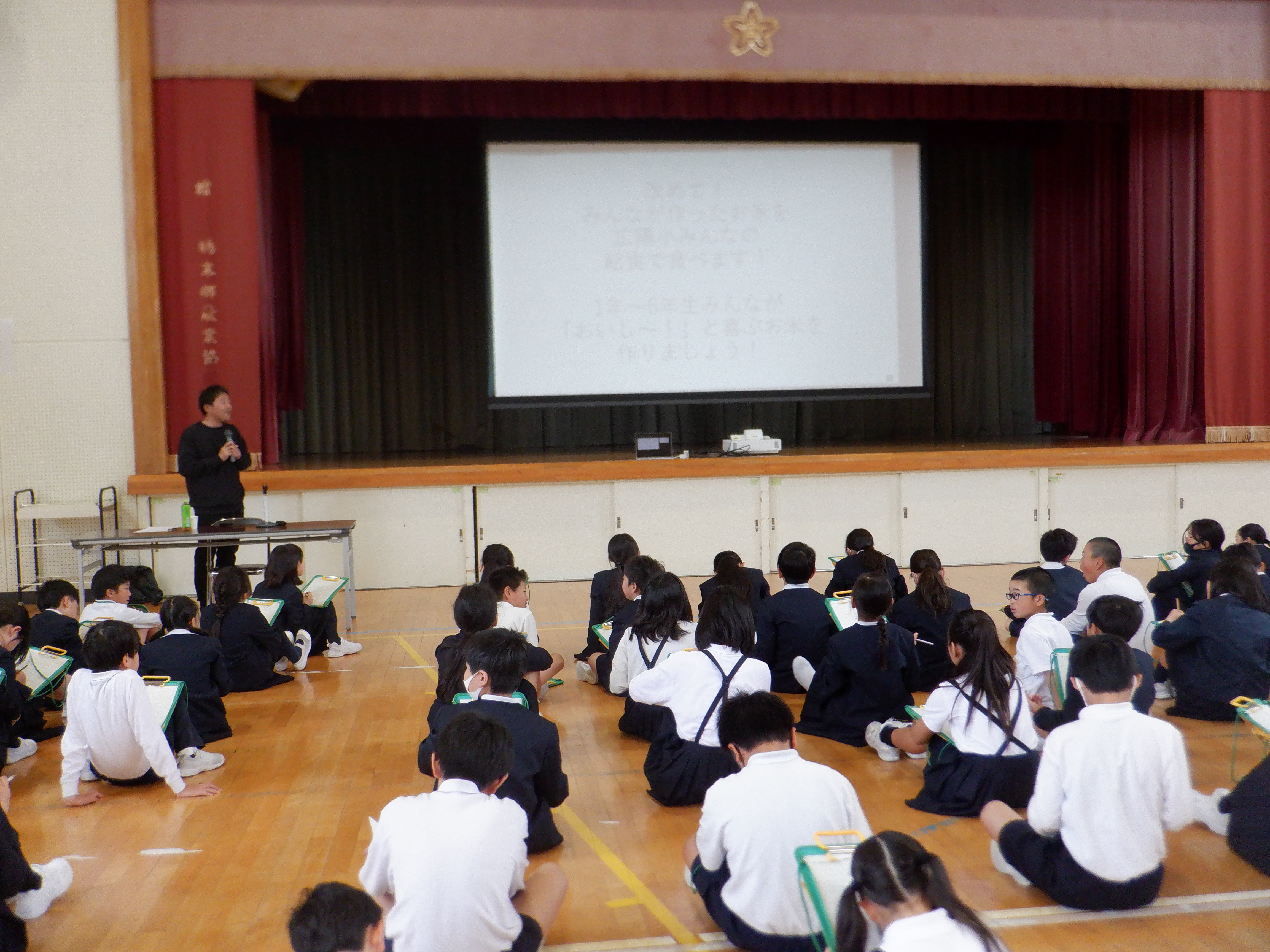 | 5月9日(金)5年生が米作り体験を行うにあたり、田んぼの先生である舘喜洋さん(北辰農産)をお招きし、どのようにしてお米を作るのかの見通しとジオ学習との関連についてお話ししてくださいました。今年度、5年生が白山市のジオ学習の発表を行います。学習の成果を表しましょう! | |