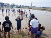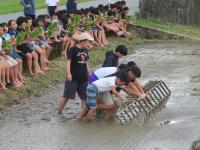 5月22日(木)5年生は代かき体験を行いました。水が張られた田んぼに、子ども達が足を突っ込んで、何とも言えない感触を味わいながら、代かきを行いました。田んぼの中を歩いてドロドロに柔らかくしました。これで田植えの準備は万全です。田植えは5月30日(金)に行う予定です。 |