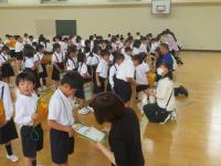 7月10日(木)不審者対応訓練が行われました。白山警察署の協力を得て、体育館で防犯教室を行いました。警察署の方から、校内に不審者が来た場合、まずは放送をしっかり聞くこと、外で不審者に遭った場合は「いかのおすし」を守ることが大切だと教えていただきました。また、「こども110番の家」の紹介もあり、この家がどこにあるかを確認するとよいですね。 |