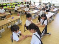 7月9日(水)たてわり遊びで平和の折り鶴を折りました。毎年、平和週間を受けて折り鶴を折っています。千羽鶴にして、広島の平和祈念公園に送ります。高学年が低学年にやさしく鶴の折り方を教えていました。たてわりの絆が深まりました。 |