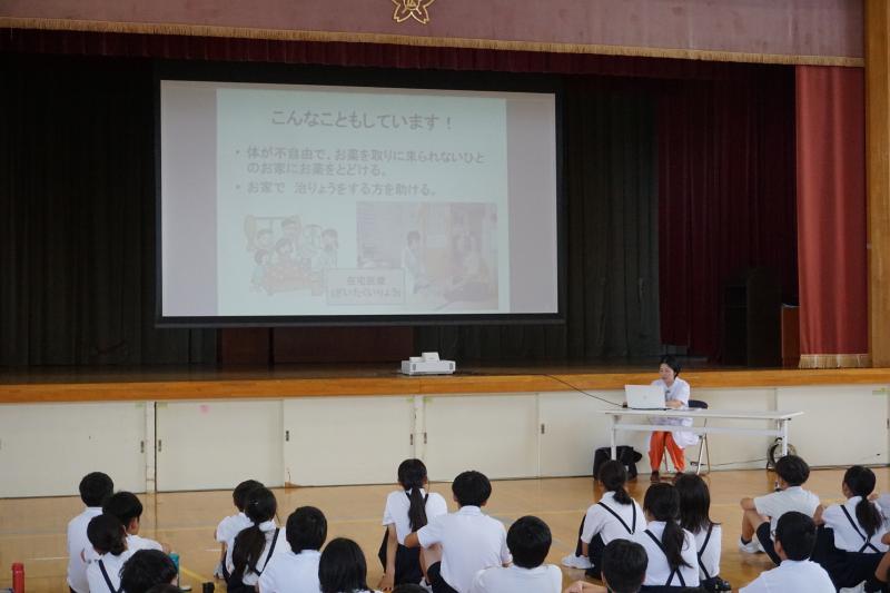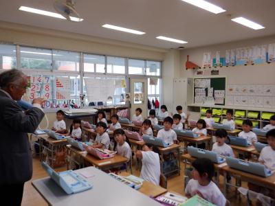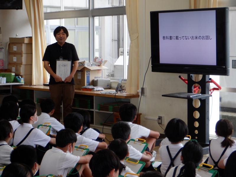 先日、代かきと田植えを経験させていただき、今日は「教科書に載っていないお米の話」を舘さんにしていただきました。日本の地形や生き物と絡めたお米の話を聞くことができました。これからの総合の学習にもいかしていきたいですね。