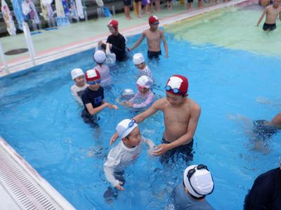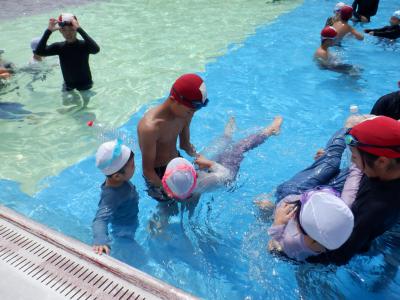 洋服を着たまま水の中に入ると、動きにくいことや服が重たくなることを体験しました。