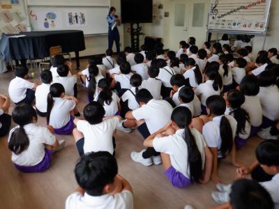生活科「いきものと なかよし」の学習で、石川県ふれあい昆虫館にて、昆虫館の見学や館内スタッフによる昆虫の講演を聞きました。世界の昆虫に驚きや、興味を示す反応をしたり、苦手な児童はおそるおそる除いている姿が見られました。昆虫のお話では、毒々しい姿をした幼虫の話に色々な表情を浮かべながら真剣に話を聞くことができました。
