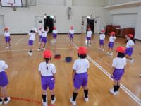 体育科のボールを蹴る活動にて、球体のボールでなく、フリスビー型のボールを使った活動を実施しています。