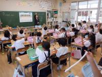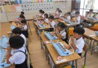 初めての鍵盤ハーモニカ教室にて、ヤマハから講師がきて教えてくれました。初めての鍵盤ハーモニカにワクワクした顔で吹いている児童の姿が見られました。