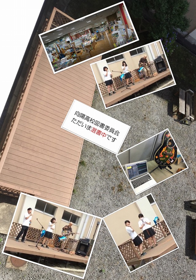 6/11(mon)の昼休みに図書館紹介ライブ「図書館にきまっしま!」を行いました.向陽高校には同窓会からいただいた中庭ステージというものがあります.文化祭のときには,自主企画の発表場所としてとても盛り上がるのですが,それだけではもったいないと図書委員会か図書館から出て,中庭ステージで,ライブパフォーマンスと図書館紹介トークのコラボを行いました.実は1年生ターゲットだったのですが,3年生パフォーマーのお友達がたくさん集まって,,,これもあり?