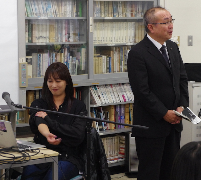 お話いただく中村千穂さん(本校卒業生)を,誇らしげに紹介する校長先生と中村さん.