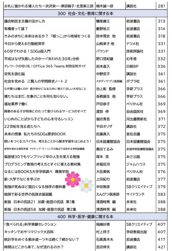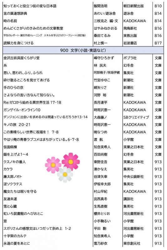 以下,昨年度購入,開架した自慢の約300冊です。限られた予算の中,生徒・教職員の希望を聴き,地域の方のことも意識して司書さんが選書しました。検索にもかかりますが一覧でお届けします。