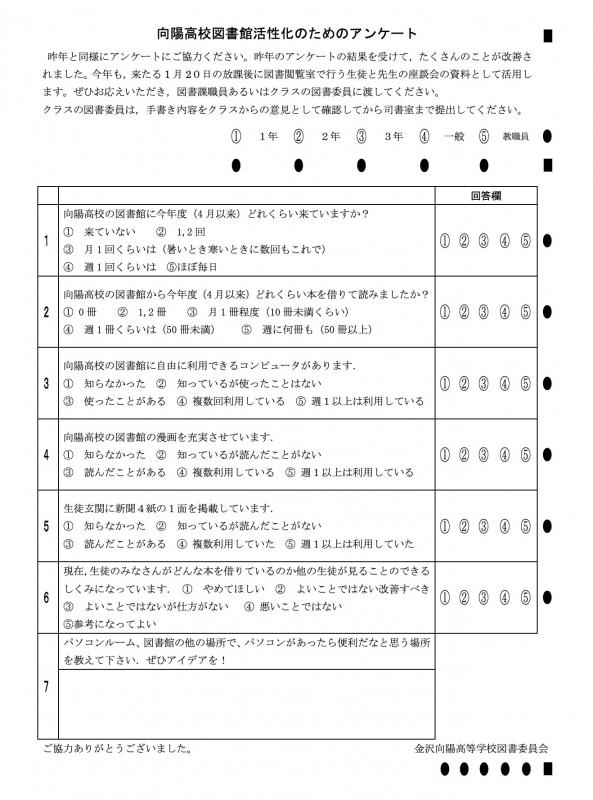 金沢向陽高校にも他校同様,図書委員会があり図書館が有効に活用されるよう,生徒の立場からいろいろな取り組みを行っています.