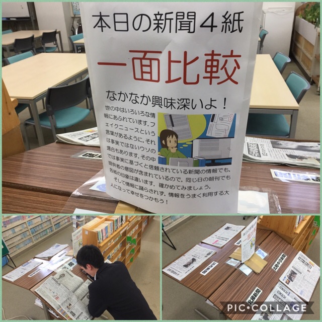 これまで学校に分かれて置かれていた4つの新聞を、今年の1月より、当日朝から図書館で閲覧できるようにしました。情報リテラシー育成のために、大変に有意義なことだと協力いただきました。