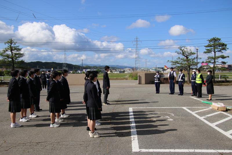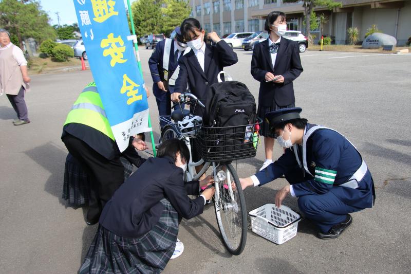 5月24日(水)本校の校門周辺にて「ヤングイーグル隊」活動を本校公安委員とバドミントン部と教職員等の約20名が参加しました。金沢東警察署の警察官の方と一緒に自転車マナーについて呼びかけを行い、自転車に乗ってきた生徒には、自転車に反射材の取り付け、ヘルメット着用の啓発チラシの配布を行いました。