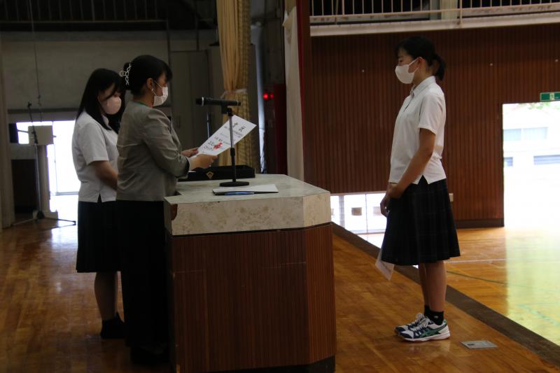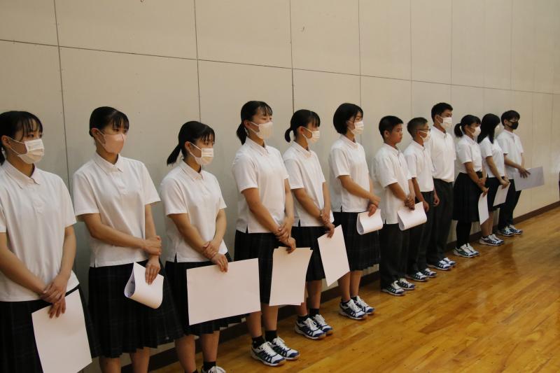 続いて行われた北信越大会壮行式では、女子バドミントン部とアーチェリー部の主将が決意を述べ、生徒会長と校長先生から激励の言葉があり、最後は、生徒全員による校歌と拍手で選手の健闘を祈りました。