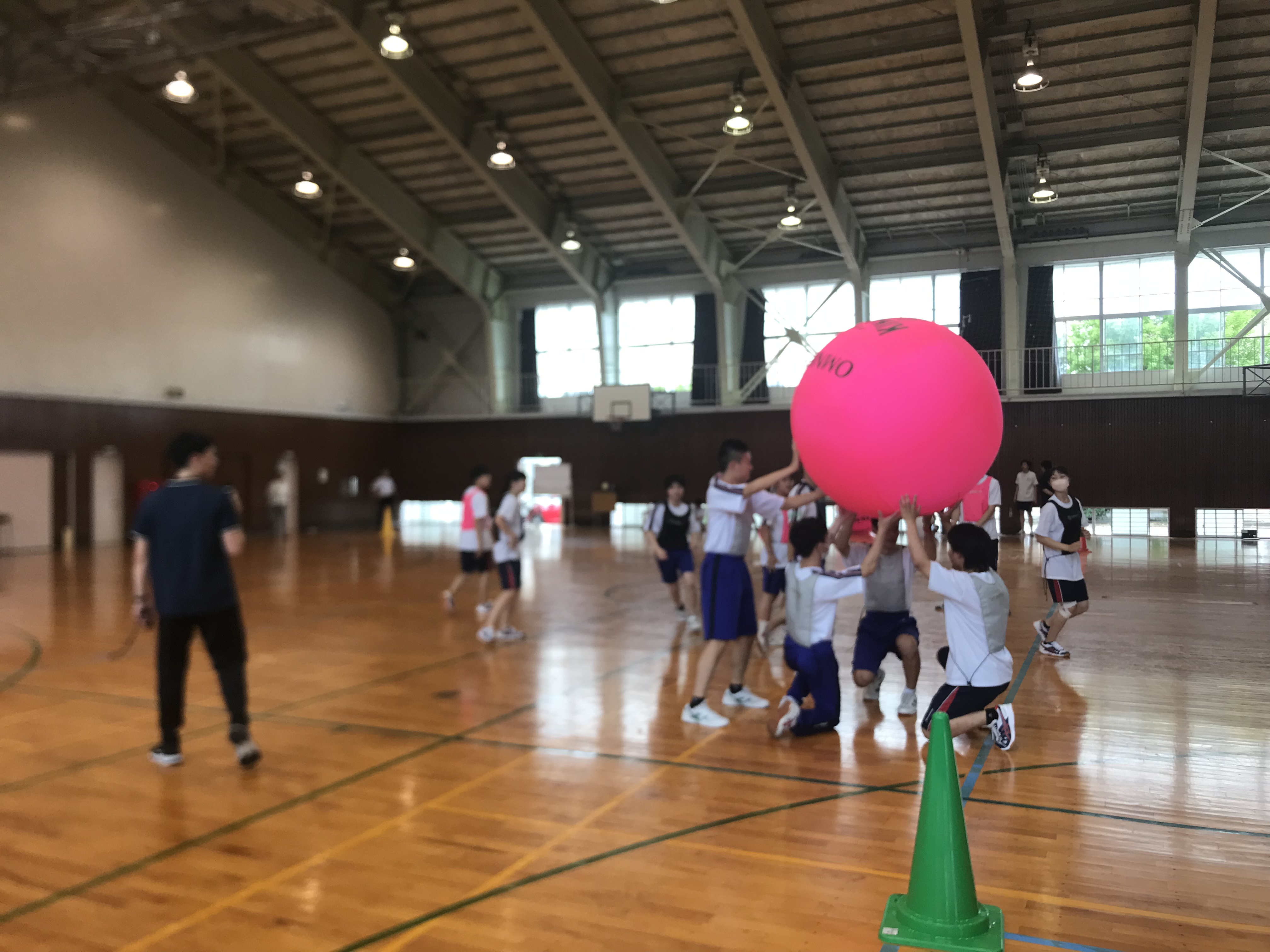 直径122cm・重さ1kgの巨大で軽いアドバルーンのようなボールを床に落とさないように、チームで協力し合う競技になります。相手チームの色を発声してボールを飛ばし、相手チームがキャッチできずに床に触れたらポイントになります。