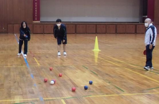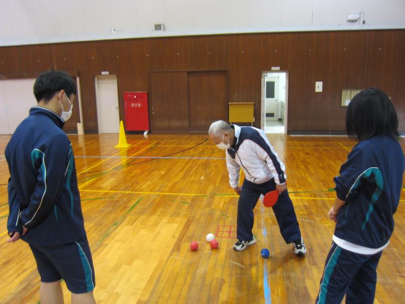 12月15日、3年生ニュースポーツの授業にて、石川県ボッチャ協会の作間祥一会長を講師にお迎えし、