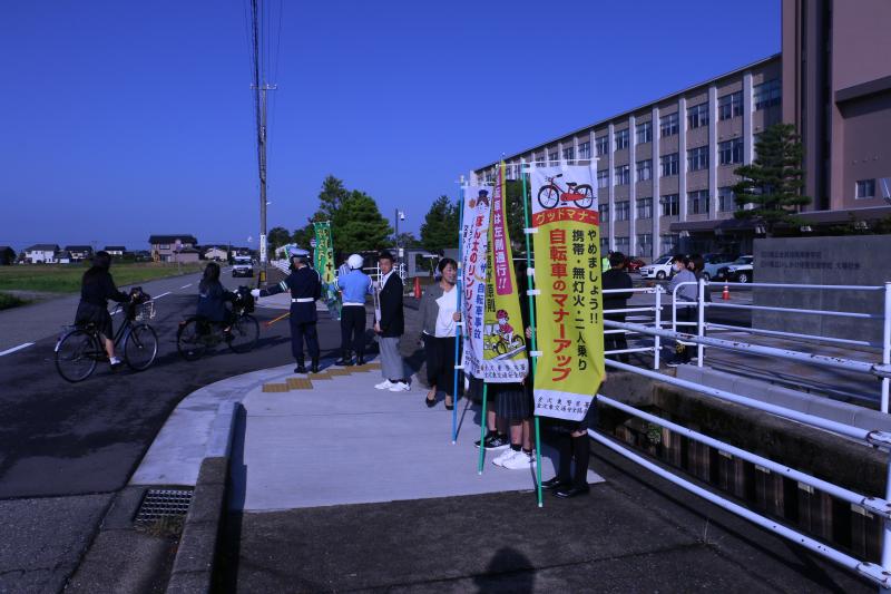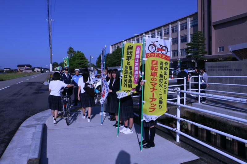 本日、晴天の中、第2回目のヤングイーグル隊の活動を行いました。今回はいしかわ特別支援学校の生徒と合同で、金沢東警察署と交通安全協会の方々のご協力のもと、自転車マナーや自転車の施錠、今後始まる自転車の取り締まりについての呼びかけました。参加者は自分自身にも言い聞かせながら積極的に呼びかけを行い、登校してくる人たちに理解と協力を得ていました。少し残念だったのが、自転車通学の生徒たちのヘルメット着用率の低さです。自分の命を守るために非常に大切で、義務ではないから大丈夫ではなく、もしものためにしっかりと着用してもらいたいと思います。