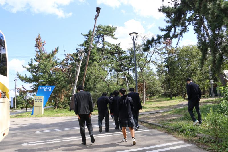 現地では、見附島や旧蛸島駅、鉢ヶ崎を見学し、以前とは変わり果てた姿で、自然の猛威についても考えさせられました。震災の爪痕のが多くの場所で残っていましたが、ガイドさんのお話などから復興に向けて前に進んでいる姿を目の当たりにしてきました。また、道の駅すずなりでは飯田小学校の四十住校長先生から、当時のこと、現在の課題、これからの能登についてお話をしていただきました。まだまだ、復興も道半ばであると思いますが、皆さんが力を合わせて前に進んでいることを肌で感じました。事前学習で自衛隊の方からお聞きしていたことや写真で見ていたものを実際に見ることができ、生徒一人一人の防災に向けての意識が向上した1日になりました。
