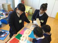 園児のみなさんは目を輝かせながらゲームに参加し、生徒たちも優しく声をかけたり手伝ったりしながら、温かい交流の時間を過ごすことができました。活動を通して、相手を思いやることの大切さを改めて感じる1時間となりました。