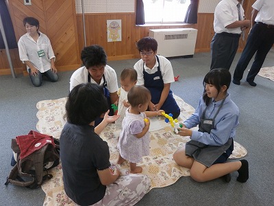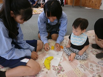 9月25日1年生の家庭科の授業で親子交流授業を実施しました。9組の親子が生徒と交流しました。小さな子どもを育てていて大変なことや嬉しいことなどをインタビューし、優しく答えてもらいました。赤ちゃんはとてもかわいく、会場の教室は優しい時間が流れていましたよ。「うわ、柔らかい」「ちょっと怖い(抱っこ)」「可愛い」と可愛い赤ちゃんを優しい目で見ていました。