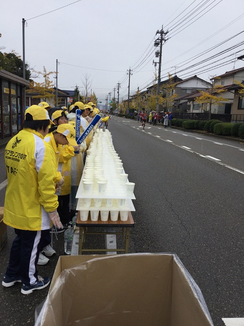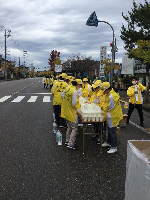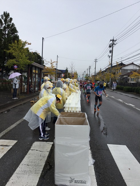 1万3000人のランナーが通り過ぎました。写真にはありませんが、道がランナーであふれていました。給水でお礼を言ってくれるランナー、仮装しているランナー、秋の雨の中、金沢向陽高校のボランティアはよくがんばってくれました。