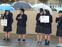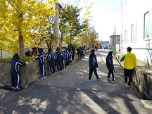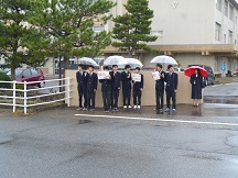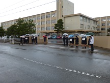 教育ウィークが始まりました。部活動の生徒が校門であいさつ運動を行います。大きな声で「挨拶」「正しい服装」「交通ルール遵守」を呼びかけています。
